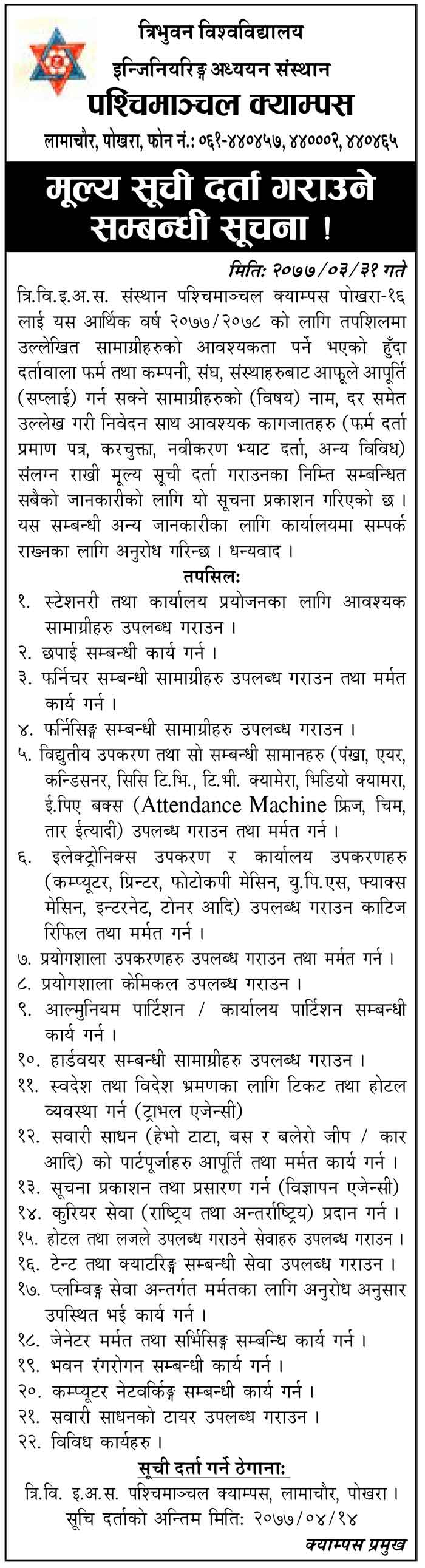 मूल्य सूची दर्ता गराउने सम्बन्धी सूचना ! Admin Noticeमूल्य सूची दर्ता गराउने सम्बन्धी सूचना !July 22, 2020